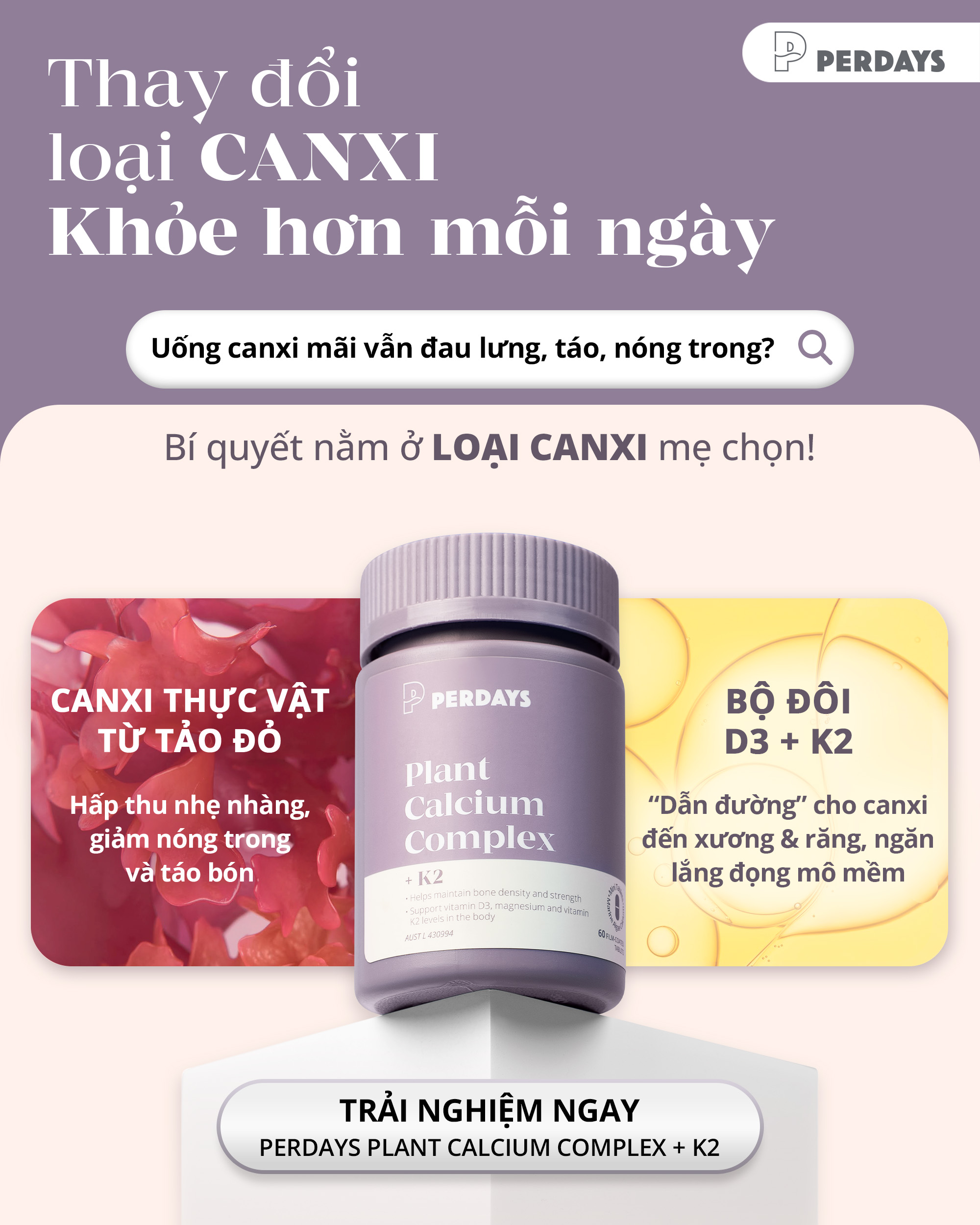 Perdays Plant Calcium Complex + D3K2 là sản phẩm được sản xuất tại Úc, với công thức 3 trong 1 bao gồm: